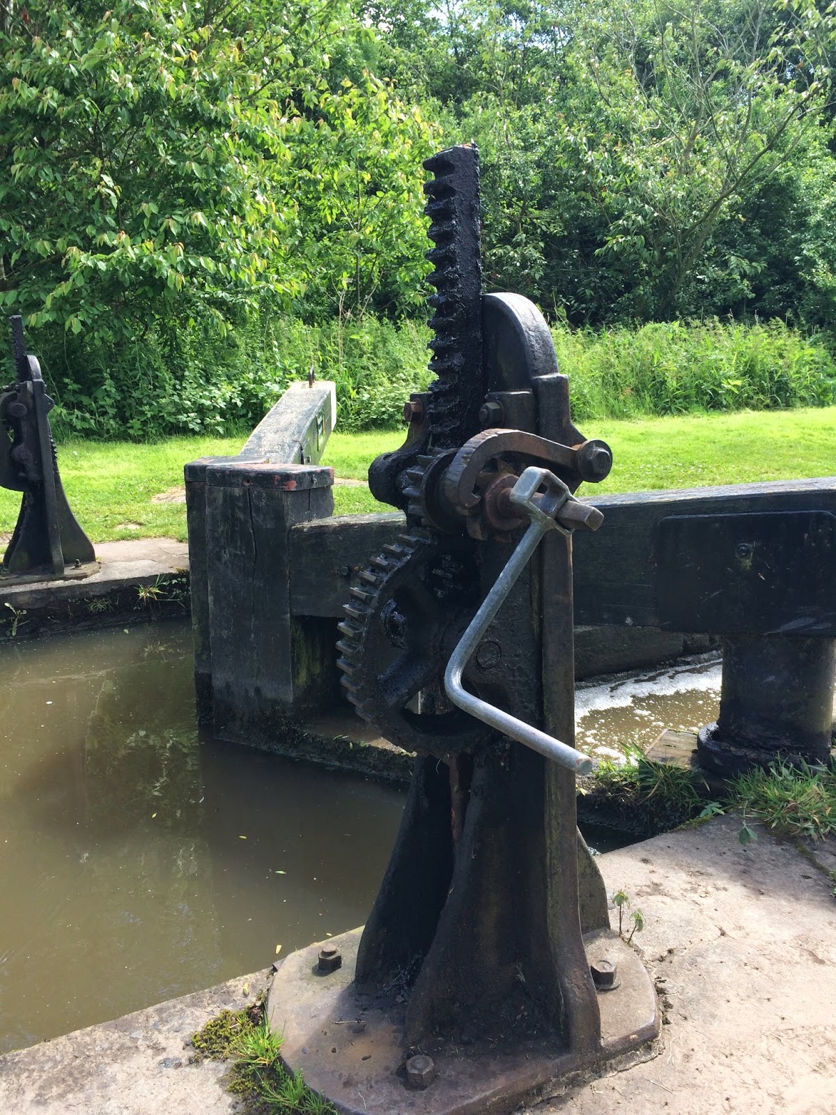 | Typical lock - I've left the windlass attached to show it in 'action'. The part sticking up is what gets cranked up to release the water. Then it has to be cranked back down once the gates are opened. |