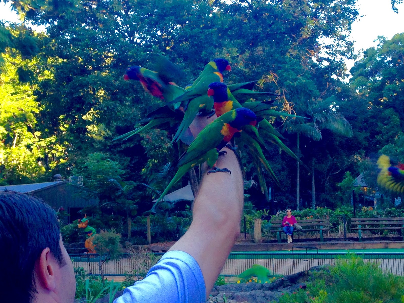 Lorikeet feeding time. This happens twice daily at the park and is a major attraction. Literally hundreds of the birds come to be fed by park attendants and tourists (who fork over a bit of cash for the privilege) |
